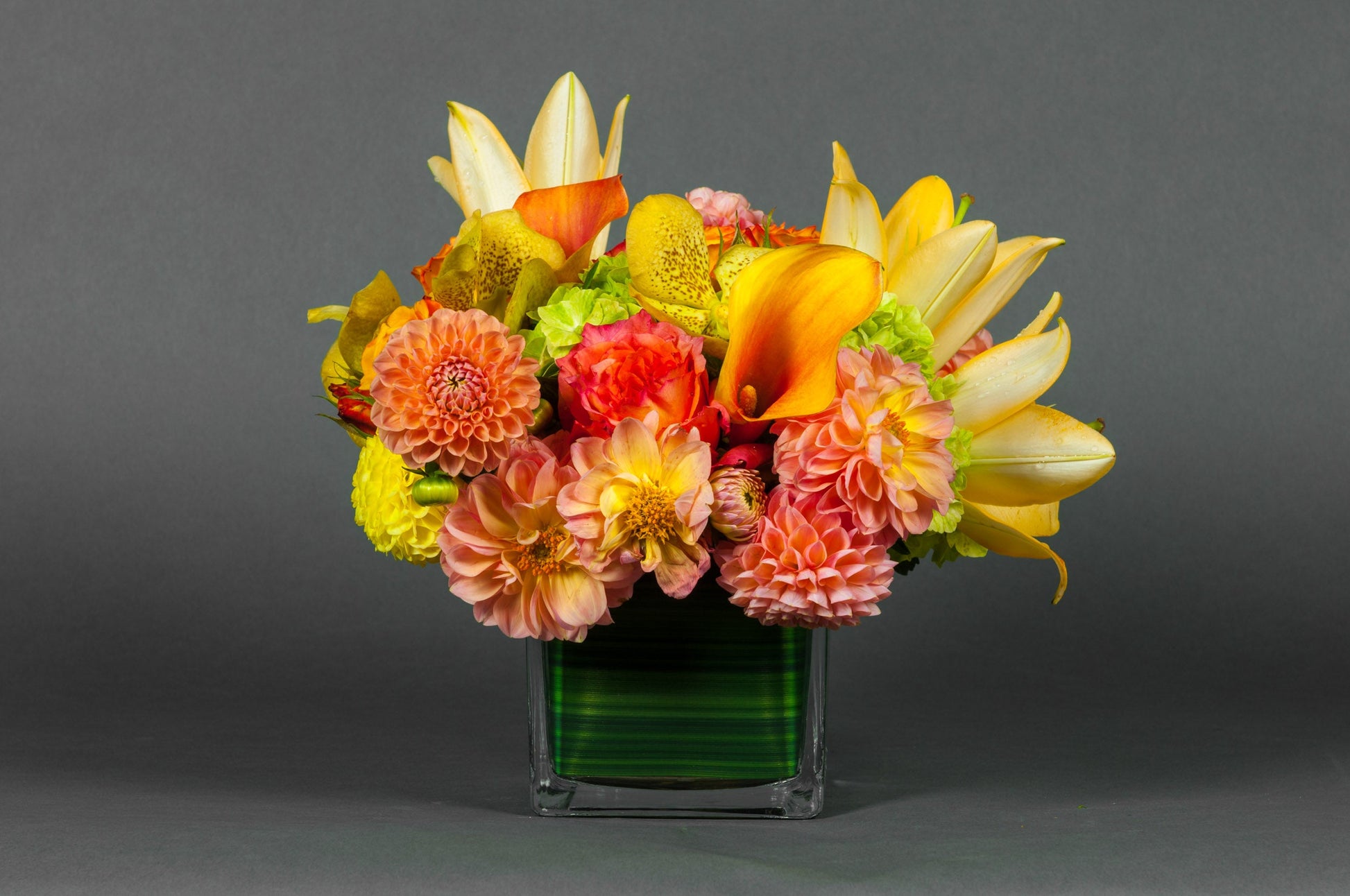 (Approximately 10” H x 10” W) A delightful and fragrant array of vibrant autumn blossoms beautifully arranged in our signature 4 leaf-lined glass vase. A clever of locally grown dahlias, hydrangeas, fragrant roses, mango callas, oriental lilies, and exotic vanda orchids will add a touch of autumn to any day.