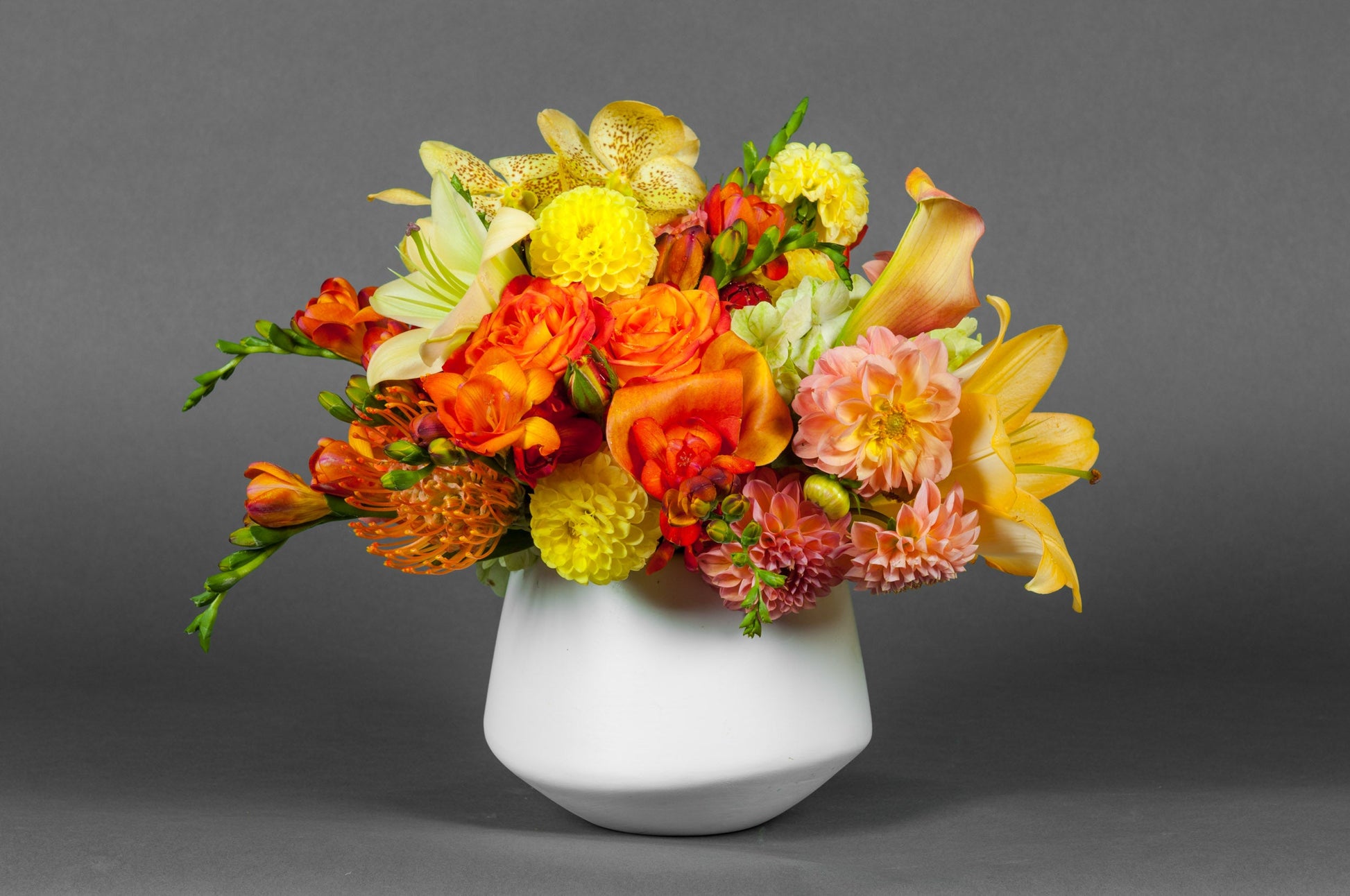 (Approximately 12” H x 14” W) An exhilarating collection in an autumn color palette inspired by the stunning autumn foliage of Central Park. Our crisp white vessel is overflowing with dahlias, mango callas, hydrangeas, oriental lilies, sweetly fragrant mandarin freesia and exotic vanda orchids would make a perfect addition to any setting.