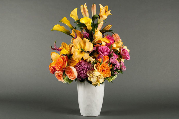 (Approximately 28 H 14 W) A lavish display of summer blossoms bursting with fragrant melon colored lilies, delicate garden roses beautifully paired with pink hydrangeas, bouvardia, veronica, calla lilies and accented with exotic Vanda orchids all artistically arranged in a hand-pressed white ceramic vase.