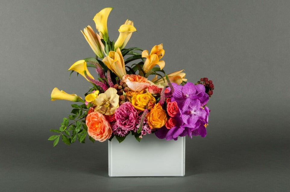 (Approximately18 H x 18 W) A captivating collection of summer flowers featuring fragrant oriental lilies, English garden roses, bouvardia, veronica, Vanda orchids, and subtle accents of wild raspberries beautifully displayed in our signature white glass vase.