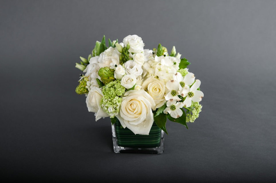 (Approximately10 H x 10 W) An adorable design of pristine white and green seasonal blossoms delightfully combining roses, ranunculus, lisianthus, viburnum, parrot tulips, arabicum and flowering dogwood gently placed in our classic 4 inch leaf-lined glass cube.