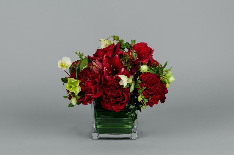 (Approximately 10” H x 10” W) A delightful and fragrant array of red garden roses and amaryllis accented with winter evergreen and helleborus, gently placed in our classic 4 leaf-lined glass cube.