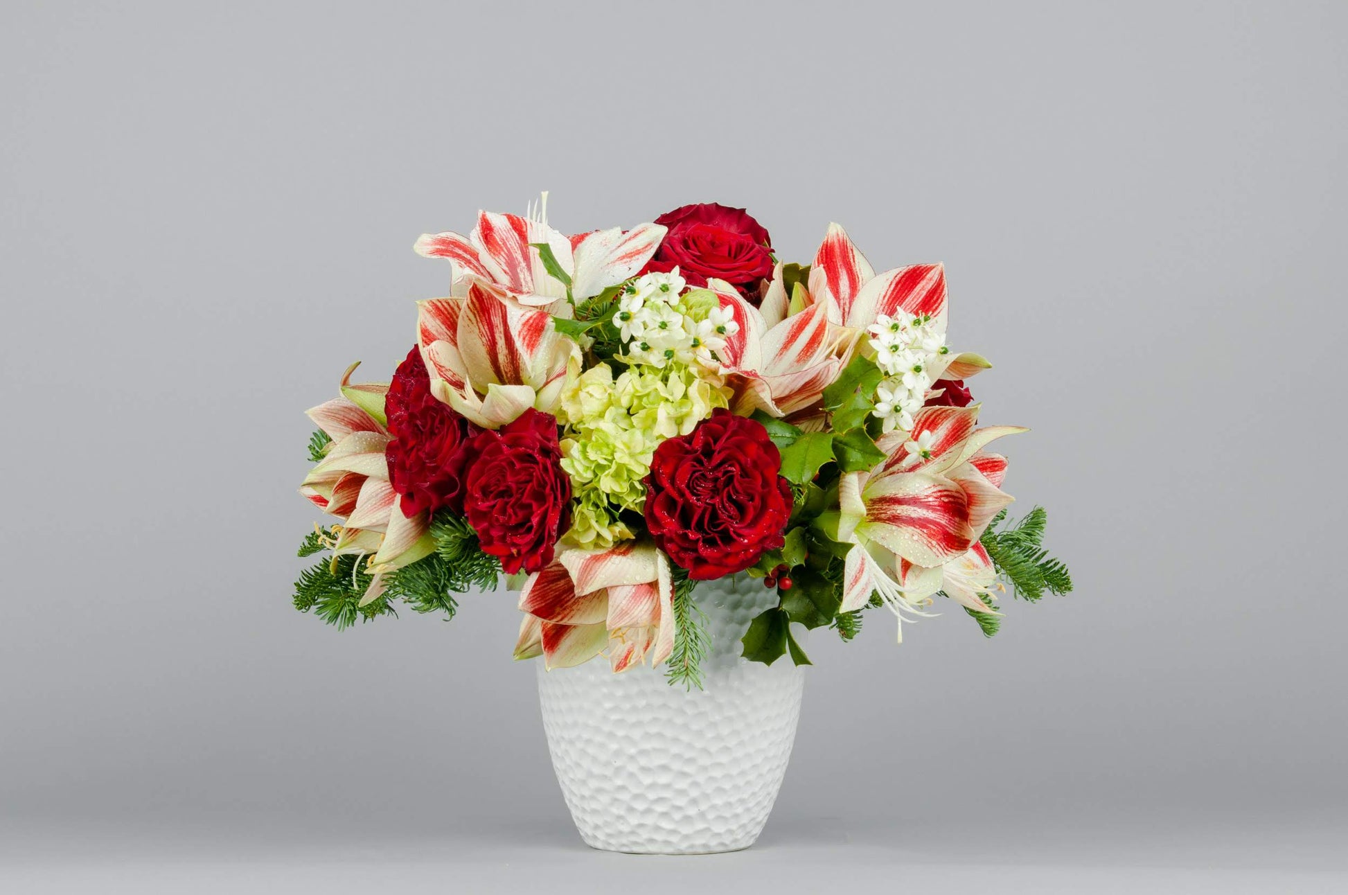 (Approximately 16” H x 16” W) An enchanting classic design of candy striped amaryllis, red garden roses and arabicum, beautifully accented with seasonal foliage and gently placed in a white, hand-pressed ceramic vase
