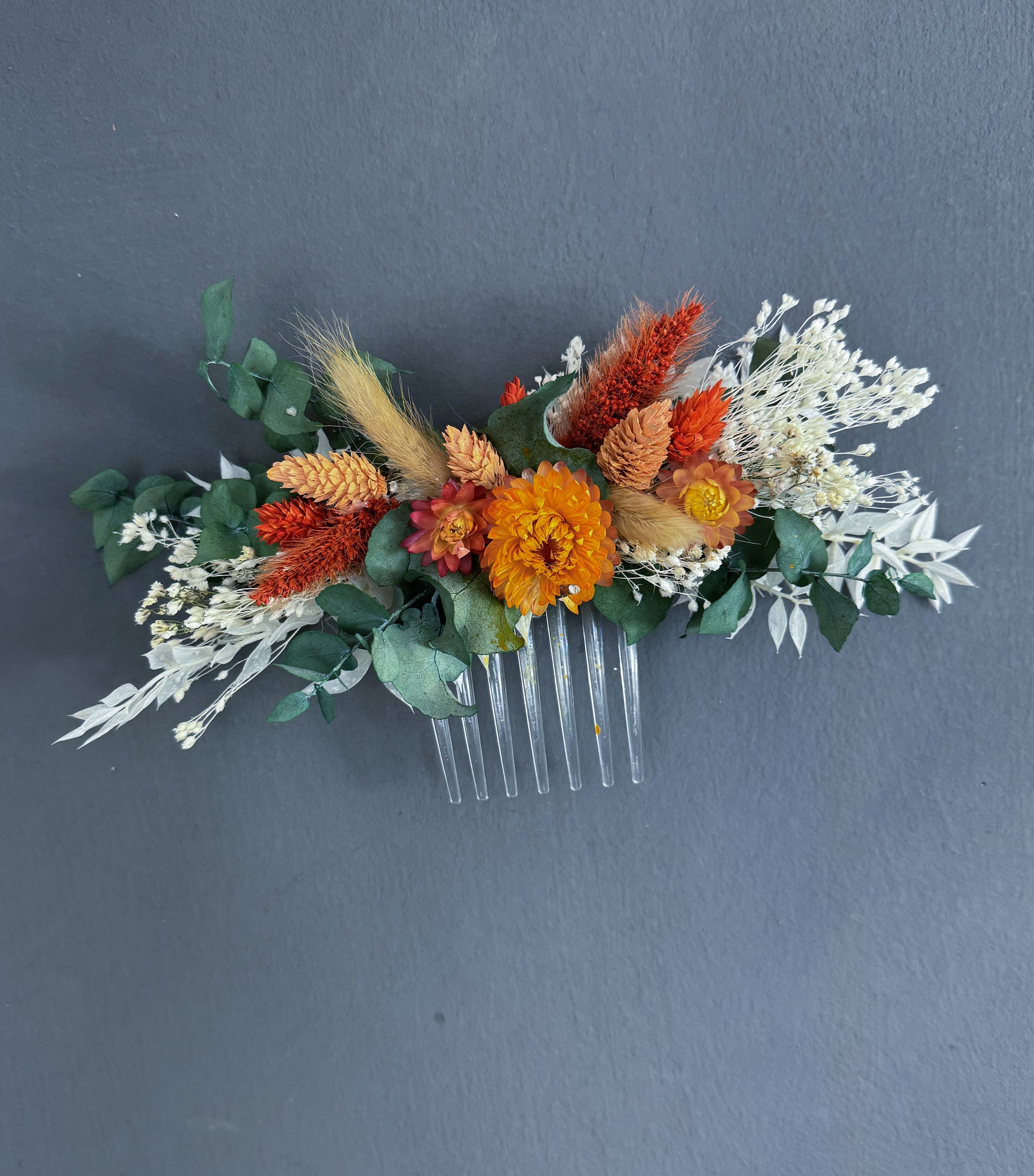 Blending a mix of beautiful dried flowers in greens, whites and warm oranges, the Mara dried flower hair comb adds the perfect wow factor to bridal or bridesmaid hair.