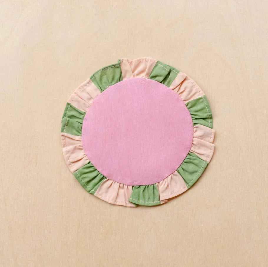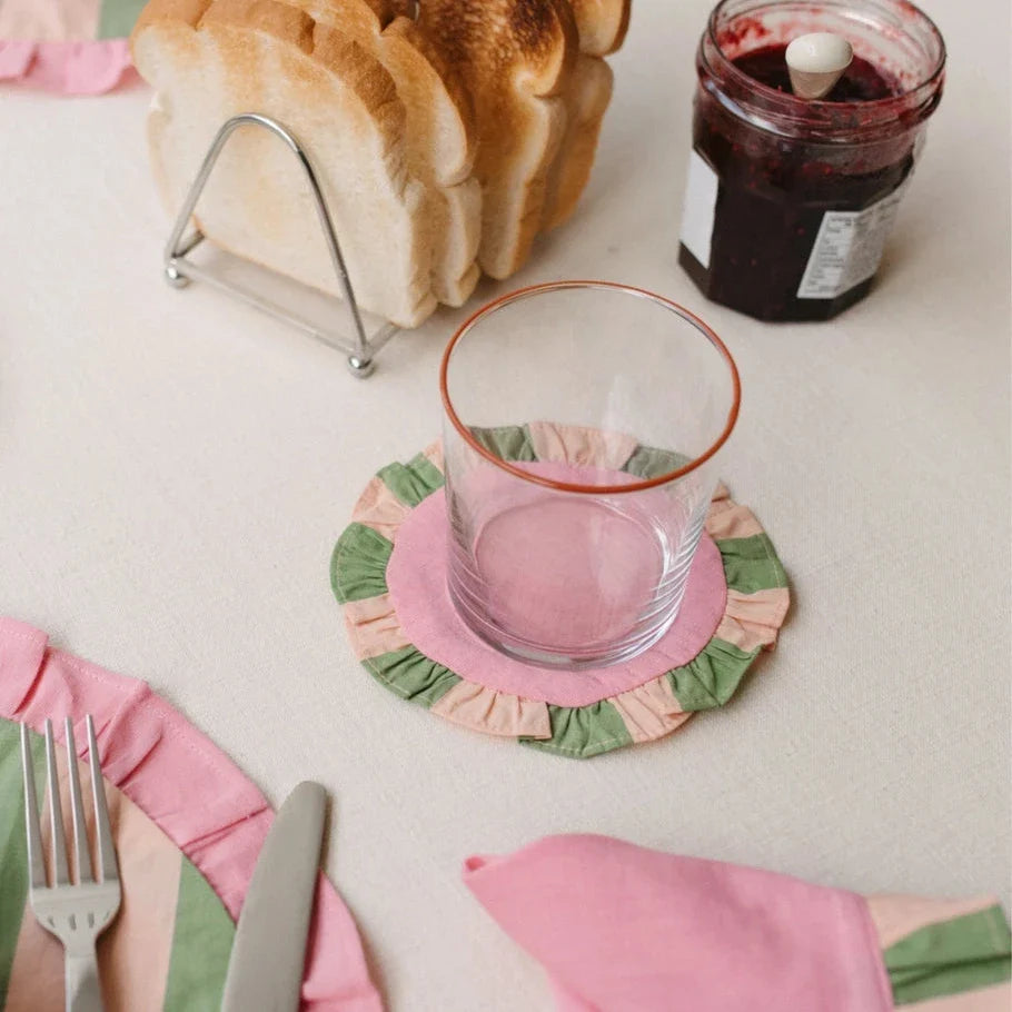 Add personality to your space while protecting your surfaces with these fun & frilly coasters. Fully reversible, they feature a contrasting checkerboard ruffle around the hem. Mix and match them with TBCo's napkins to complete the look.