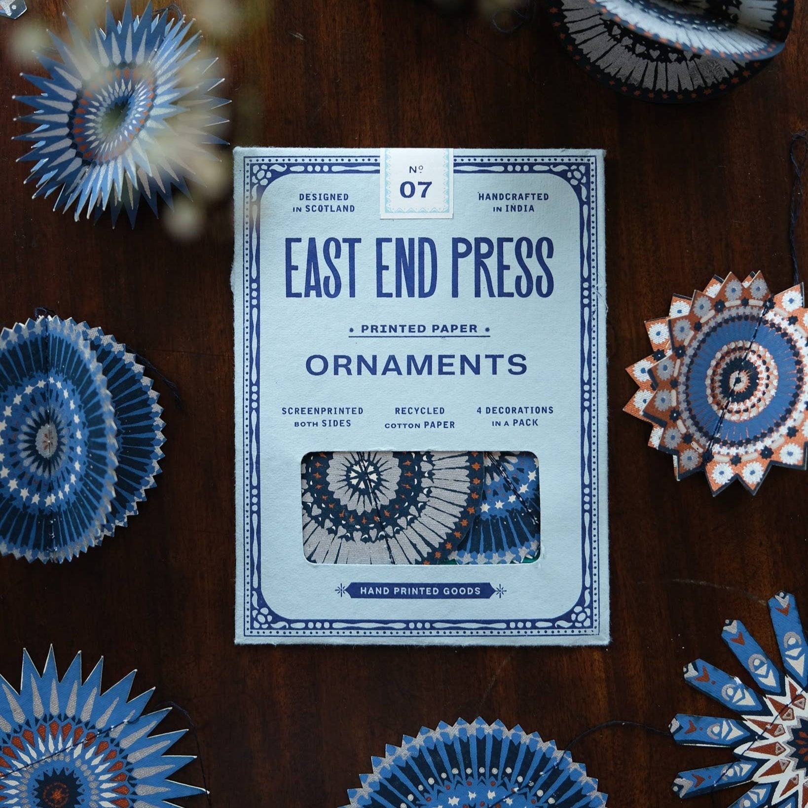 Inspired by moorish tile designs, this set of four paper star decorations will add a festive touch to any Christmas tree. Screen printed on both sides with splashes of metallic ink for that extra sparkle!