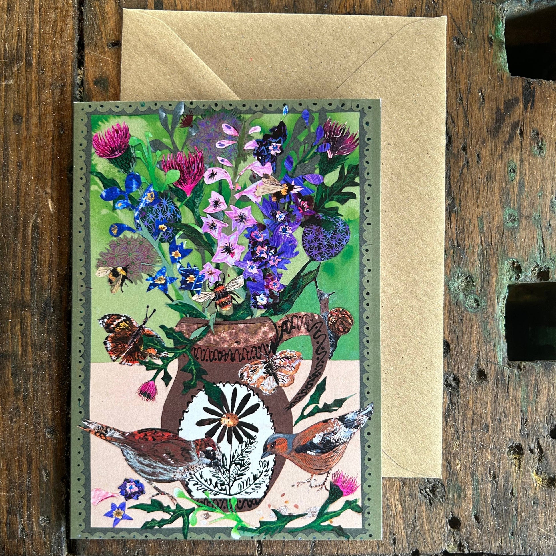 Beautifully illustrated card depicting blooms in a vase. Blank inside for your own personal message, the card comes with an A6 Kraft envelope.
